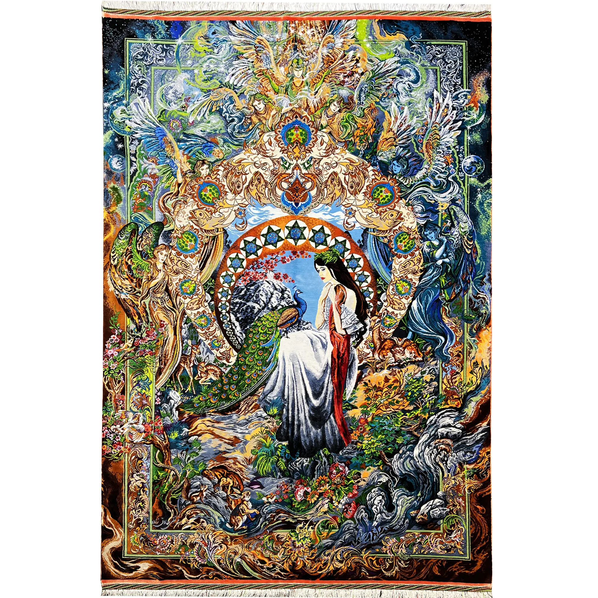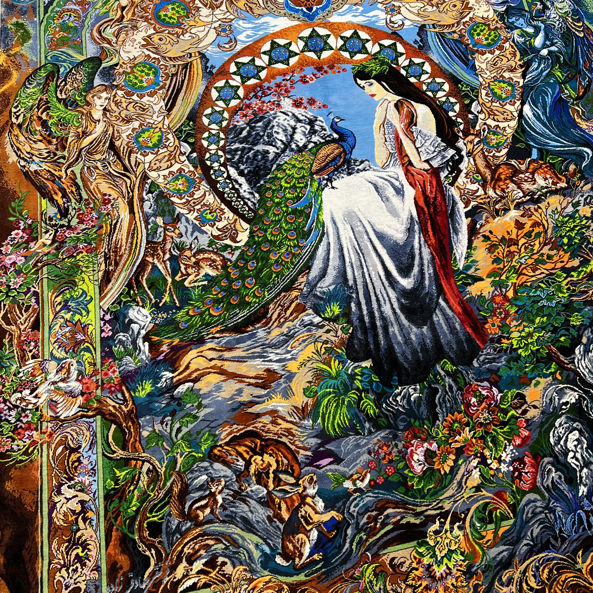 دورتا دور فرش، فرشتگان هستند و این دختر زیبا آفریده شده و روی پاهاش طاووس گذاشته‌اند.