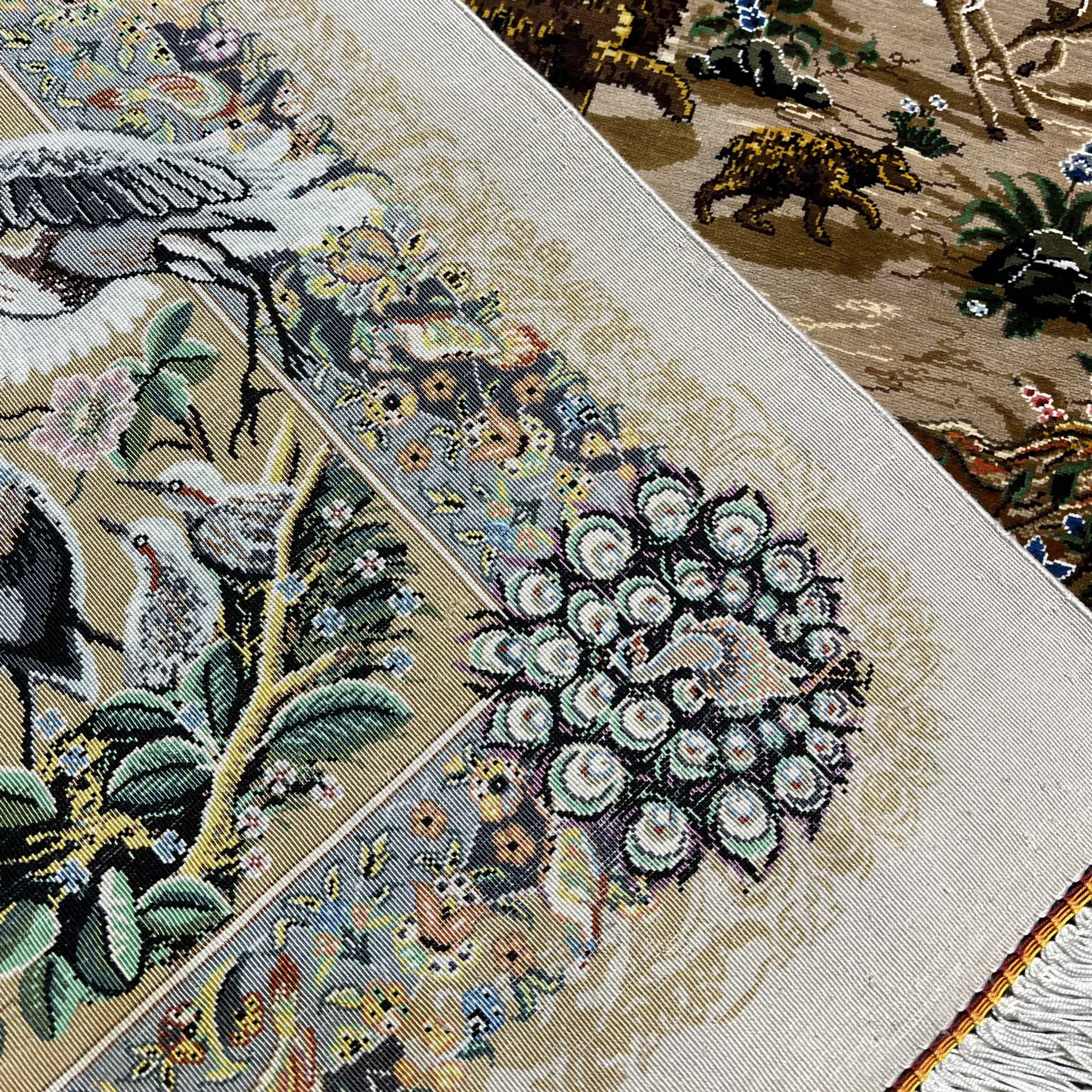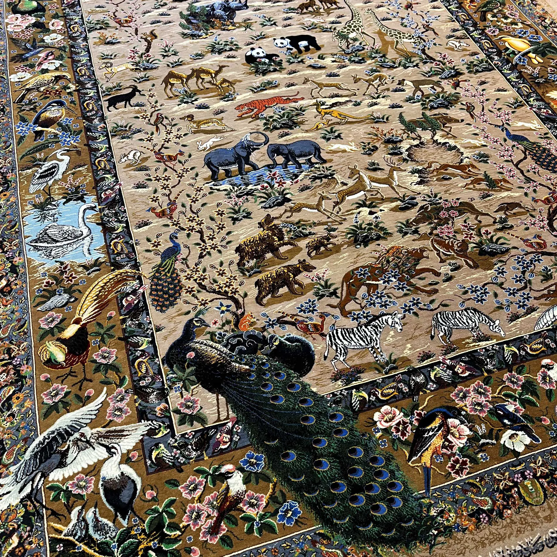 فرش نقشه بوم جنگل حیوانات تمام ابریشم قم، حاشیه باغ پرندگان