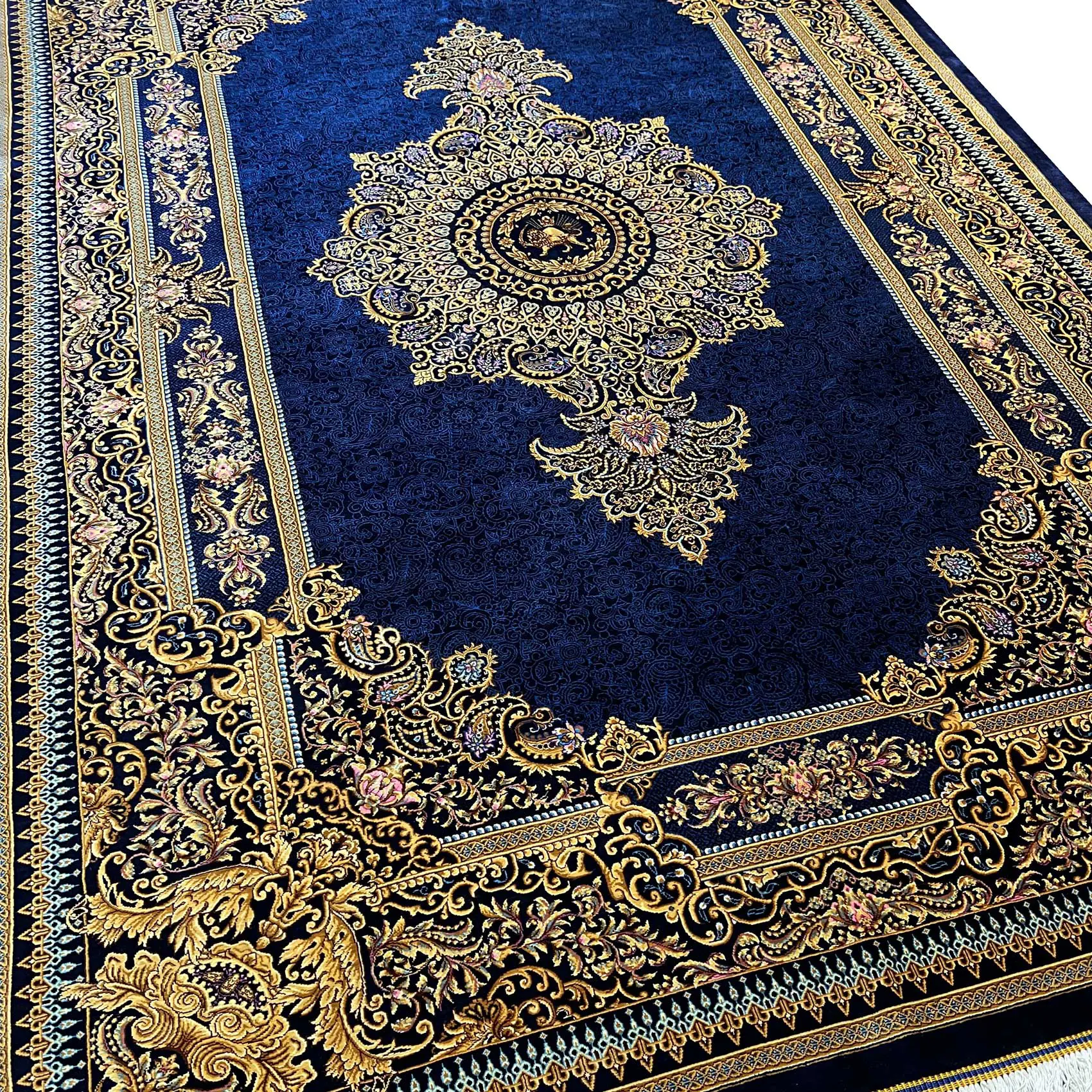 قالیچه سرمهای-طلایی تمام ابریشم قم